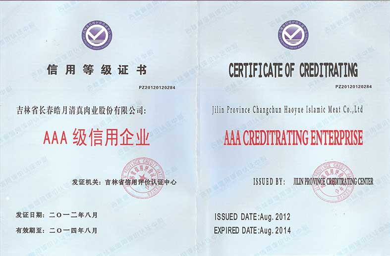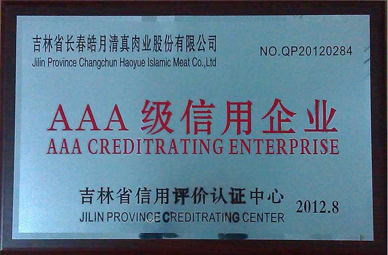 吉林省信用評(píng)價(jià)認(rèn)證中心AAA級(jí)食用企業(yè)等級(jí)證書